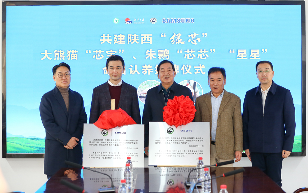 12月8日,共建陕西“绿芯”项目大熊猫、朱鹮命名认养揭牌仪式在秦岭四宝科学公园举行。一只1岁大熊猫被认养命名为“芯宝”,两只4岁朱鹮分别被认养命名为“芯芯”“星星”。省林业局党组成员、副局长、省林业科学院党委书记刘保华,省林业科学院副院长、秦岭大熊猫研究中心主任雷颖虎,三星(中国)半导体有限公司副总裁徐正贤出席仪式。