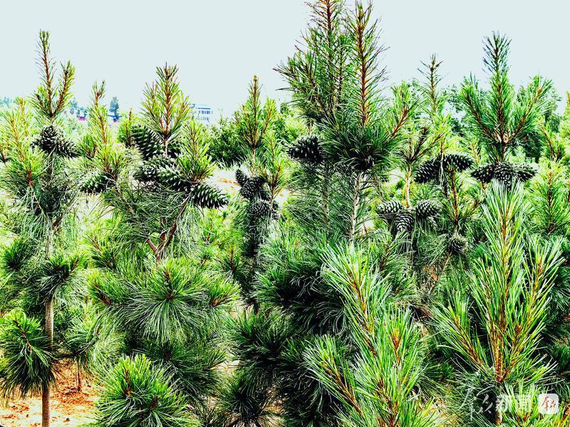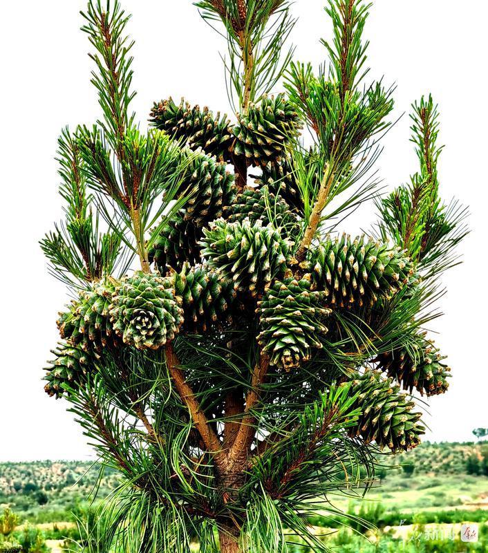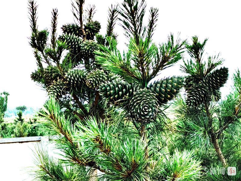 红松产业建设成果初显,潜力巨大。如今,成果已清晰可见。在神木市中鸡镇红松苗木基地,红松枝头果实累累,部分枝条因挂果太多而被压弯,需辅助支撑。从育种到结果,基地熬过了漫长的5年,如今数百亩松树硕果盈枝。