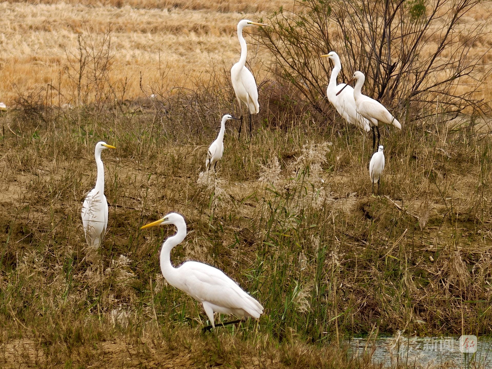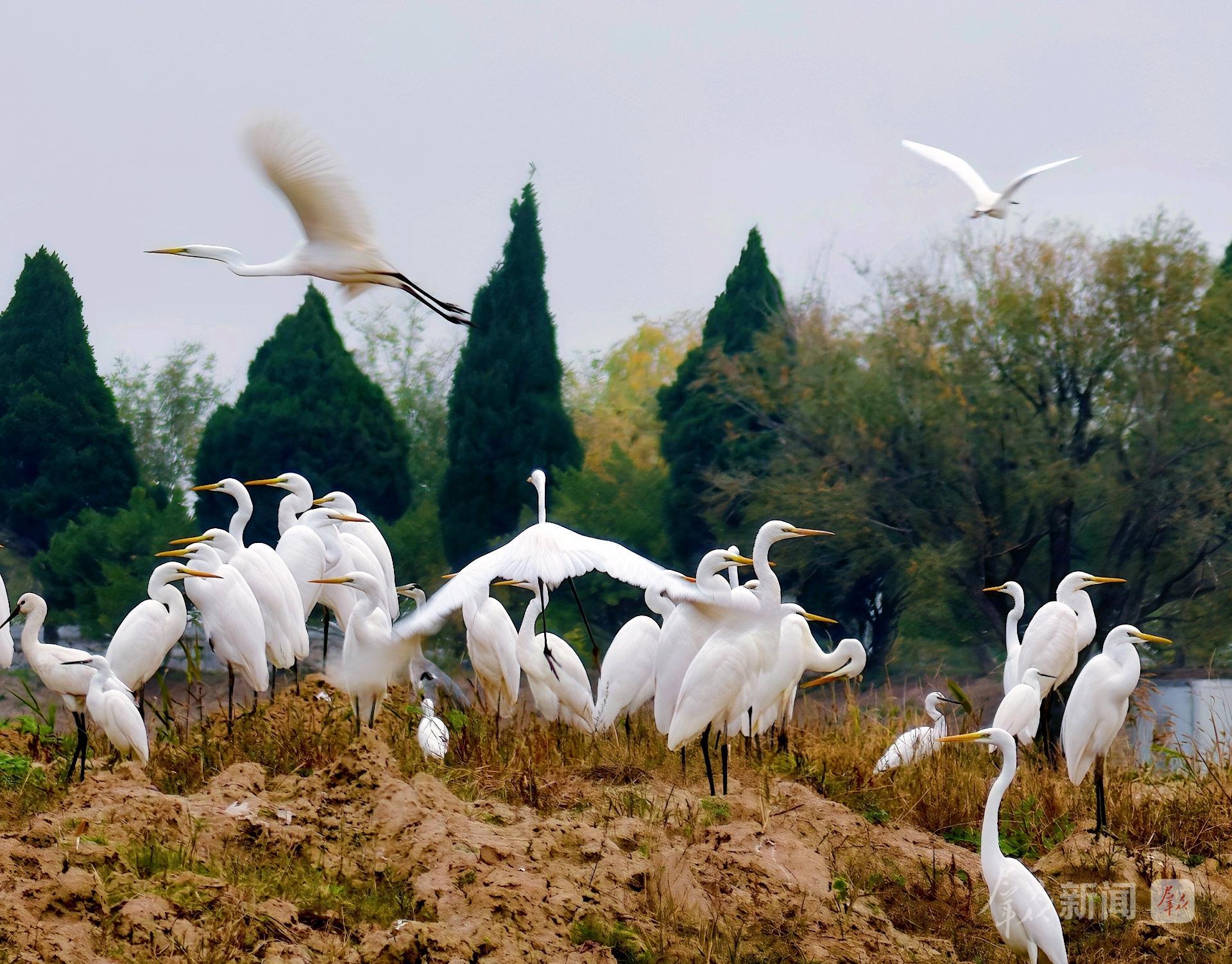 11月23日,记者在渭南市大荔县范家镇拍摄到成群白鹭。它们有的“昂首挺胸”,有的展翅高飞。