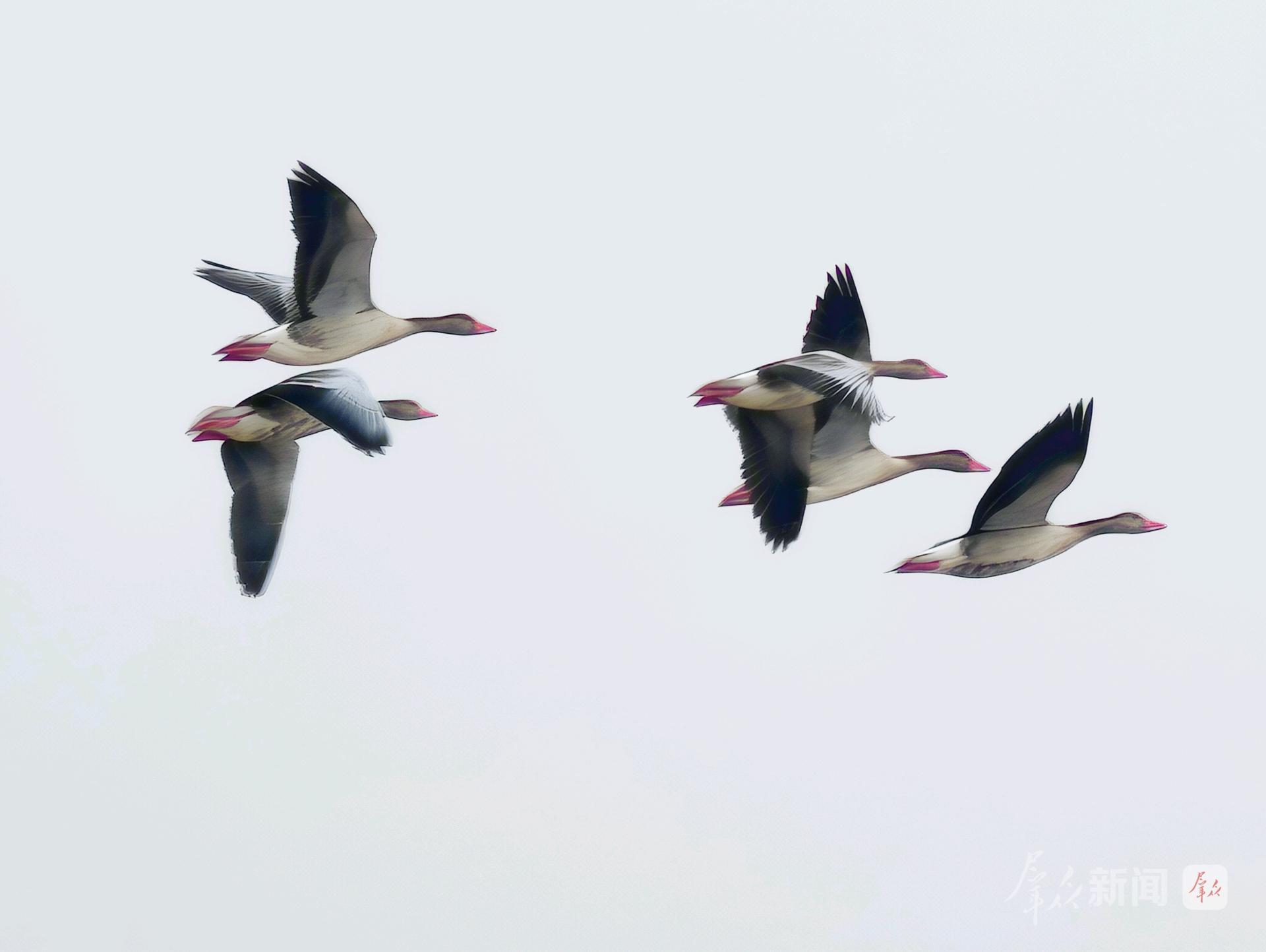 11月23日,在渭南市大荔县赵渡镇,几只豆雁展翅高飞。豆雁是“三有”保护野生动物。