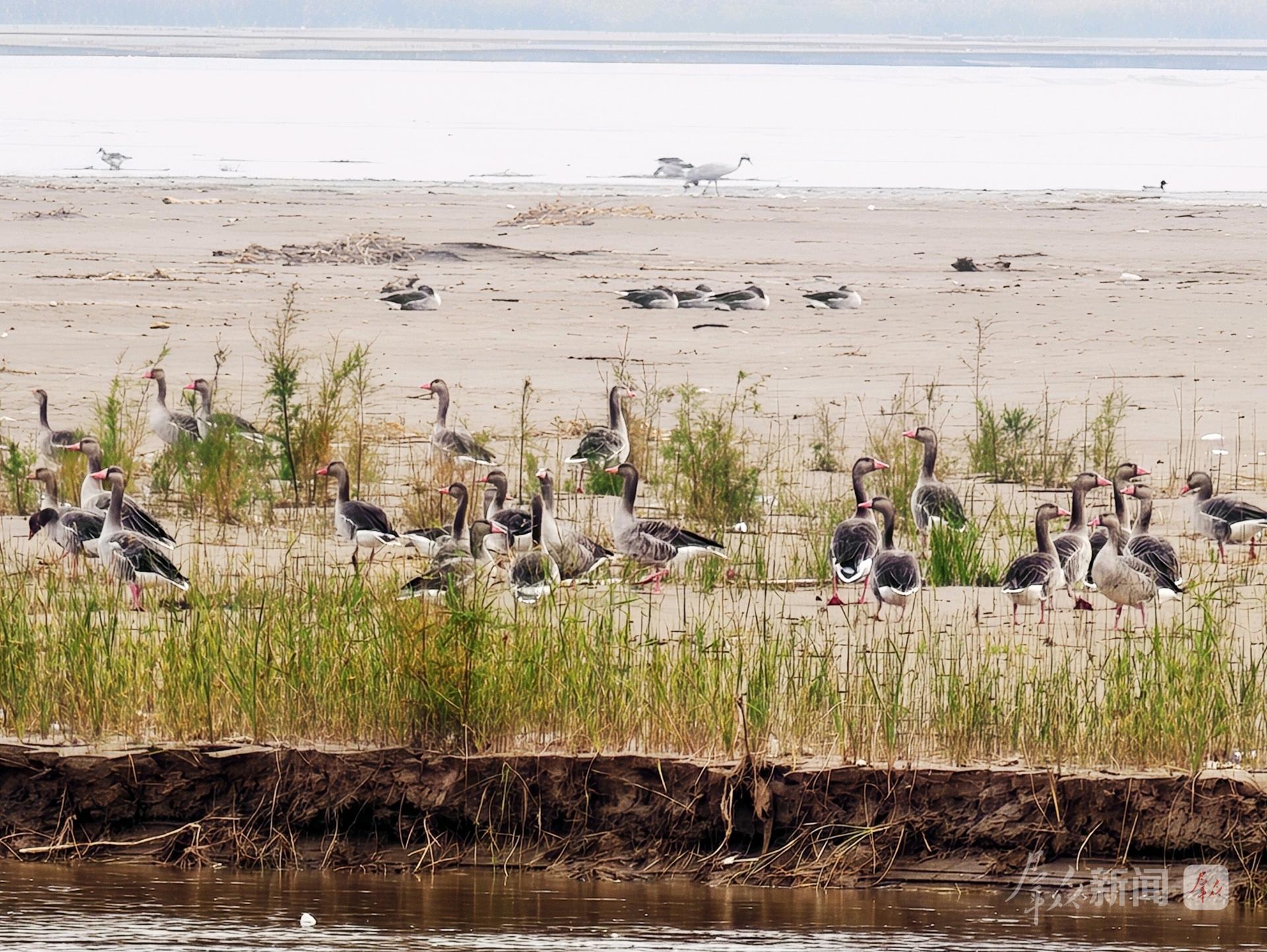 11月23日,在陕西黄河湿地省级自然保护区大荔段,成群结队的豆雁在滩涂上悠闲“散步”。