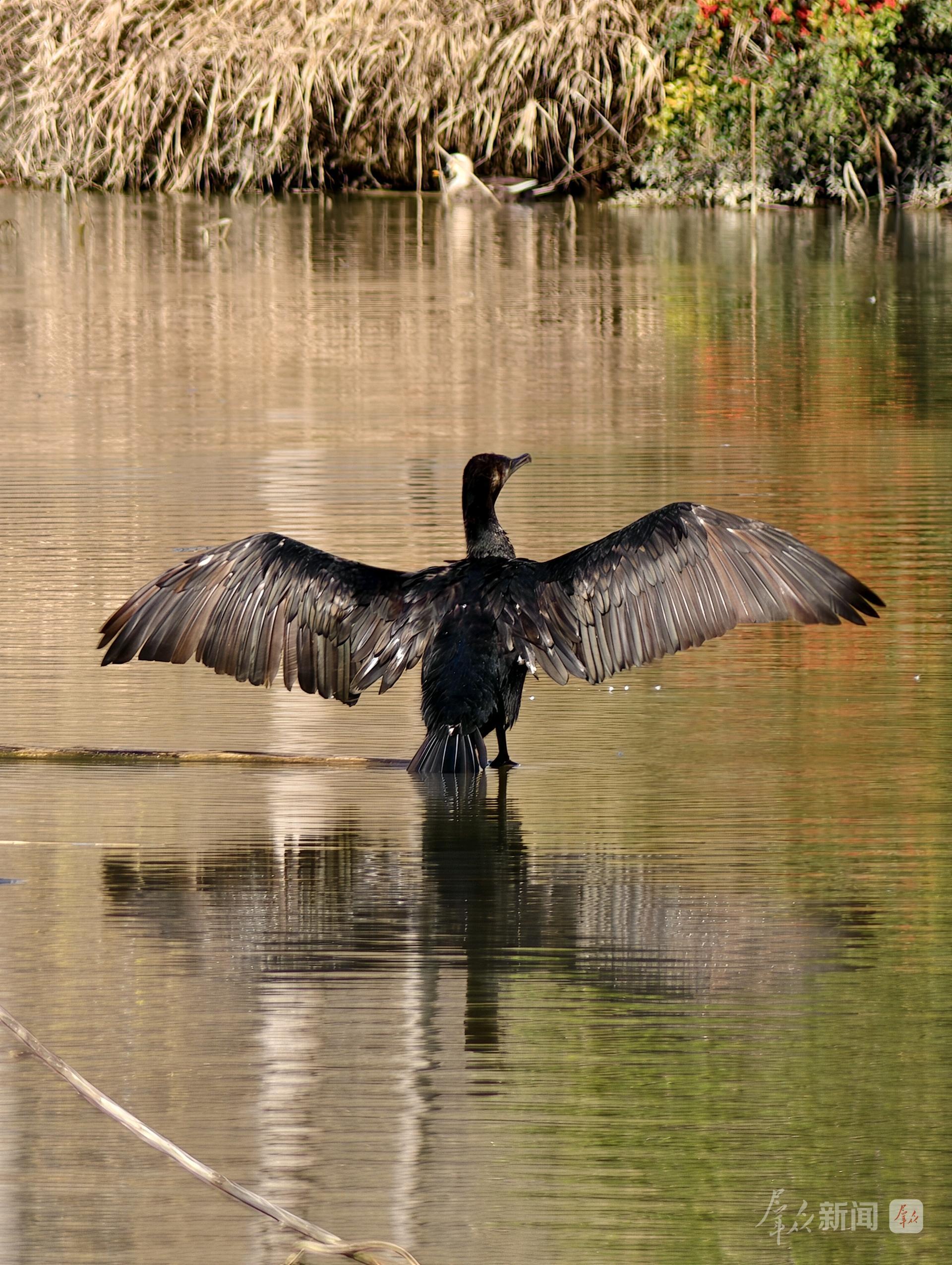 11月24日,在西安浐灞国家湿地公园,一只鸬鹚双翼展开如墨色帆影。
