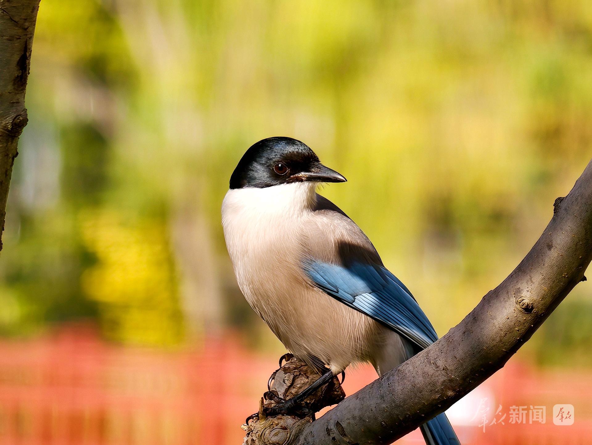 11月24日,在西安浐灞国家湿地公园,暖阳透过林间缝隙洒落,一只灰喜鹊在树枝间站立,黑色的头顶与亮蓝色的翅尾在绿叶映衬下格外醒目,为冬日的城市湿地注入了生机。